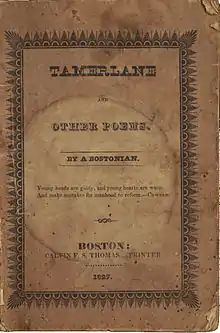 The title poem, "Tamerlane", depicts a dying conqueror who regrets leaving his childhood sweetheart and his home to pursue his ambitions.[33] In its original form, "Tamerlane", based on the historical Timur, was 406 lines.[14] The choice of an eastern character was unusual for a westerner at the time, though Byron, François-René de Chateaubriand, Thomas Moore and others had written other Orientalist works.[34] Autobiographical overtones suggest Poe based the poem on the loss of his own early love, Sarah Elmira Royster,[22] or of his birth mother Eliza Poe.[35] The poem may also mirror Poe's relationship with his foster father John Allan; similar to Poe, Tamerlane is of uncertain parentage, with a "feigned name".[23]