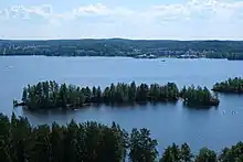 Tampere is part of the Pirkanmaa region and is surrounded by the municipalities of Kangasala, Lempäälä, Nokia, Orivesi, Pirkkala, Ruovesi, and Ylöjärvi.[82] There are 180 lakes that are larger than 10,000 m2 (1 ha) in Tampere, and fresh water bodies make up 24% of the city's total area.[18] The lakes have formed as separate basins from Ancylus lake approximately 7500–8000 years ago.[83] The northernmost point of Tampere is located in the Vankavesi fjard of Teisko, the southernmost at the eastern end of Lake Hervanta, the easternmost at the northeast corner of Lake Paalijärvi of Teisko and the westernmost at the southeast corner of Lake Haukijärvi near the borders of Ylöjärvi and Nokia.[84]: 11 The city center itself is surrounded by three lakes, Näsijärvi, Pyhäjärvi and much smaller Iidesjärvi. Tampere region is situated in the Kokemäki River drainage basin, which discharges into the Bothnian Sea through river which flows through Pori, the capital of Satakunta region.[83] The bedrock of Tampere consists of mica shale and migmatite,[85] and its building stone deposits are diverse: in addition to traditional granite, there is an abundance of quartz diorite, tonalite, mica shale and mica gneiss.[86] One of the most notable geographical features in Tampere is the Pyynikki Ridge (Pyynikinharju), a large esker formed from moraine during the Weichselian glaciation.[87] It rises 160 meters above sea level and is said to be the largest gravel esker in the world.[87] It is also part of Salpausselkä, a 200 km long ridge system left by the ice age.[87]