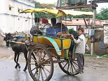A tonga or tanga is a light carriage or curricle drawn by one horse (compare ekka) used for transportation in the Indian subcontinent. They have a canopy over the carriage with a single pair of large wheels. The passengers reach the seats from the rear while the driver sits in front of the carriage.[1] Some space is available for baggage below the carriage, between the wheels. This space is often used to carry hay for the horses.