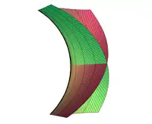 The tangent developable is a developable surface; that is, it is a surface with zero Gaussian curvature. It is one of three fundamental types of developable surface; the other two are the generalized cones (the surface traced out by a one-dimensional family of lines through a fixed point), and the cylinders (surfaces traced out by a one-dimensional family of parallel lines). (The plane is sometimes given as a fourth type, or may be seen as a special case of either of these two types.) Every developable surface in three-dimensional space may be formed by gluing together pieces of these three types; it follows from this that every developable surface is a ruled surface, a union of a one-dimensional family of lines.[2] However, not every ruled surface is developable; the helicoid provides a counterexample.