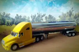 A tank truck, gas truck, fuel truck, or tanker truck (United States usage) or tanker (United Kingdom usage), is a motor vehicle designed to carry liquids or gases on roads. The largest such vehicles are similar to railroad tank cars which are also designed to carry liquid loads. Many variants exist due to the wide variety of liquids that can be transported. Tank trucks tend to be large; they may be insulated or non-insulated; pressurized or non-pressurized; and designed for single or multiple loads (often by means of internal divisions in their tank). Some are semi-trailer trucks. They are difficult to drive and highly susceptible to rollover due to their high center of gravity, and potentially the free surface effect of liquids sloshing in a partially filled tank.[1]
