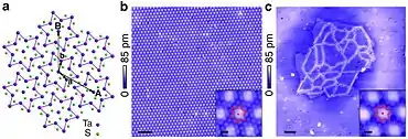 Tantalum(IV) sulfide is the inorganic compound with the formula TaS2. It is a layered compound with three-coordinate sulfide centres and trigonal prismatic metal centres. It is structurally similar to the more famous material molybdenum disulfide, MoS2. It has been the subject of numerous studies as a host for intercalation of electron donors,.[2] The 1T-TaS2 polytype exhibits some unusual properties. In common with many other transition metal dichalcogenide (TMD) compounds,, which are metallic at high temperatures, it exhibits a series of charge-density-wave (CDW) phase transitions at low temperatures. It is unusual amongst them in showing a low-temperature insulating state, which is believed to arise from electron correlations, similar to many oxides and is commonly attributed to a Mott state.[3] It is also superconducting under pressure or upon doping, with a familiar dome-like phase diagram as a function of dopant concentration. 1T-TaS2 is unique, not only amongst TMDs but also amongst 'quantum materials' in general, in showing a metastable metallic state at low temperatures. Switching from the insulating to the metallic state can be achieved either optically or by the application of electrical pulses. The metallic state is persistent at low temperatures (below ~20K), but its lifetime can be tuned by changing the temperature. The metastable state lifetime can also be tuned by strain. The switching properties may be used for low-temperature energy-efficient memory devices. Because of the frustrated triangular arrangement of localized electrons, the material is suspected to behave as a quantum spin liquid.