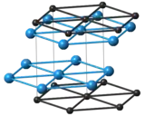 TaCx compounds have a cubic (rock-salt) crystal structure for x = 0.7–1.0;[12] the lattice parameter increases with x.[13] TaC0.5 has two major crystalline forms. The more stable one has an anti-cadmium iodide-type trigonal structure, which transforms upon heating to about 2000 °C into a hexagonal lattice with no long-range order for the carbon atoms.[8]
