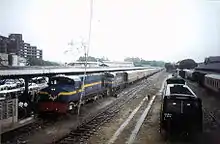 ![]() Two diesel locomotives pull a passenger train into Dar es Salaam's main railway station. | |