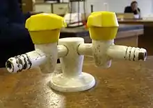 - Bib (bibcock, and hose bib or hosebibb), usually a freeze-resistant version of a "spigot".