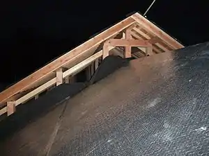 Older construction sometimes used a lighter-weight tar paper, stapled up with some overlap, as a water- and wind-proofing material on walls, but modern carpenters more often use 8-or-10-foot (2.4 or 3.0 m) widths of housewrap.
