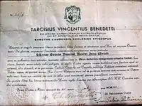Document located at Basilica of Aparecida with the signature of bishop Tarcisio Vincenzo Benedetti