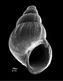 Tucker Abbott (1952),[4] Chaniotis et al. (1980)[10] and WHO (1981)[25] cite the same statistic that females can give birth to one juvenile every 12 hours.[1] Young snails emerge through a birth pore on the right side of the head.[1] The newborn shell is <1–2 mm in height with between 1.5 and 4.8 whorls.[1] The size of juveniles at birth is 0.7–2.1 mm.[1] According to Chen (2003)[7] these newborns have a high survival rate in the field.[1]