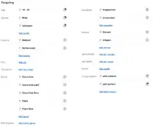 E.g. Facebook lets advertisers target using broad characteristics like gender, age, and location. Furthermore, they allow more narrow targeting based on demographics, behavior, and interests (see a comprehensive list of Facebook's different types of targeting options[14]).
