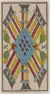 In the Tarot de Marseille, as is standard among Italian suited playing cards, the pip cards in the suit of swords are drawn as abstract symbols in curved lines, forming a shape reminiscent of a mandorla. On the even numbered cards, the abstract curved lines are all that is present. On the odd numbered cards, a single fully rendered sword is rendered inside the abstract designs. The suit of batons is drawn as straight objects that cross to form a lattice in the higher numbers; on odd numbered baton cards, a single vertical baton runs through the middle of the lattice. On the tens of both swords and batons, two fully rendered objects appear imposed on the abstract designs.[5] The straight lined batons and the curved swords continue the tradition of Mamluk playing cards, in which the swords represented scimitars and the batons polo mallets.[6]