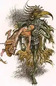 "It was roughly the shape of a man but it had the head of a bird; some bird of prey with a cruel, curved beak. It had four arms which it held high above its head, stretching them out Northward as if it wanted to snatch all Narnia in its grip; and its fingers - all twenty of them - were curved like its beak and had long, pointed bird-like claws instead of nails."