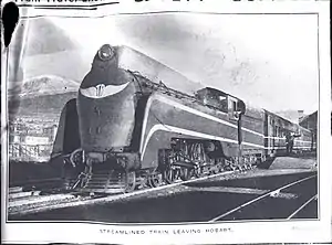 ![]() Tasmanian Government Railways R Class streamlined locomotive, departing Hobart circa 1940. | |||||||||||||||||||||||||||||||||||||||||||||||||||||||||||||||