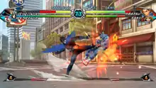 Tatsunoko vs. Capcom is a tag team-based fighting game in which players control characters with different attacks and fighting styles, and engage in combat to deplete their opponent's life gauge.[2][3] The gameplay is set in a 2.5D environment where the characters are rendered in three-dimensional graphics, but their movements are restricted to a two dimensional plane; they may only move left and right, and upward through the air.[3] Each player may select a team of two characters and can switch between them during combat. Alternatively, players may select one of two "giant" characters, who cannot be played as part of a team.[4] When characters switch, the incoming one performs a special attack upon entry, and the previous one can regenerate health.[5] Characters not in play may be used to assist, and to perform powerful team moves.[2][6] A match ends when a team has no characters left, or when the timer reaches zero—in which case, the team with the most remaining life wins.[1]
