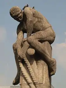 "The Herculean naked man has climbed upon the bollard, which emerges at its base from unformed rock, and, leaning forwards, is hauling the rope up in order to secure it to it. His legs are clamped around the wood [of the bollard], and while his right [hand] is busy pulling the big hawser up with all his strength, the left firmly grasps the bollard."[7]