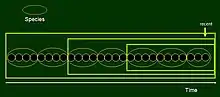 The paradox may be best illustrated by model diagrams similar to Darwin’s single evolutionary tree in On the Origin of Species.[4] In these tree graphs, dots represent populations and edges correspond to parent-offspring relations. The trees are placed into a coordinate system which is one-dimensional (time) for a single lineage, and two-dimensional (differentiation vs. time) for cladogenesis or evolution with divergence.