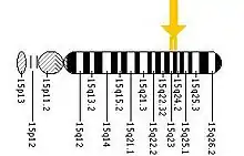 Tay–Sachs disease is caused by a genetic mutation in the HEXA gene on chromosome 15, which codes for a subunit of the hexosaminidase enzyme known as hexosaminidase A.[1] It is inherited from a person's parents in an autosomal recessive manner.[1] The mutation disrupts the activity of the enzyme, which results in the build-up of the molecule GM2 ganglioside within cells, leading to toxicity.[1] Diagnosis may be supported by measuring the blood hexosaminidase A level or genetic testing.[2] Tay–Sachs disease is a type of GM2 gangliosidosis and sphingolipidosis.[5]
