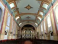 Tayabas Basilica's interior is built in the Neo-Classical style with seven altars.[13] An image of the Nuestra Señora de los Angeles ("Our Lady of Angels") stands in the central retablo of the altar.[10] Severo Carpintero, known as the Maestro Carpintero ("Master Carpenter") built the church's round transept and crossing.[11] The dome was built together with a third storey and semicircular pediment.[11] It also has an antique organ located in the choir loft and a balcony over the altar.[2] The basilica's ceiling painting was restored in the 1990s by Delfin Antiola.[14]
