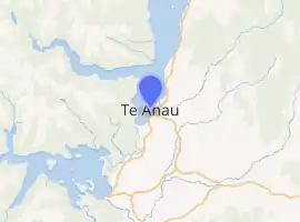 Te Anau is a town in the Southland region of the South Island of New Zealand. In Maori, Te-Anau means the Place of the Swirling Waters.[3] It is on the eastern shore of Lake Te Anau in Fiordland. Te Anau is 155 kilometres north of Invercargill and 171 kilometres to the southwest of Queenstown (via state highway 6). Manapouri lies 21 kilometres to the south. Te Anau lies at the southern end of the Milford Road, (State Highway 94) 117 kilometres to the south of Milford Sound / Piopiotahi.
