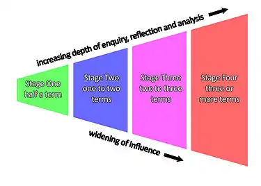 Stage Two required the “sphere of influence” to be extended so the teacher's learning affected their colleagues. Stage Two presentations required evidence of reflection whereas Stage One was simply a descriptive account of the learning; this was done through a “learning breakthrough”. Stage One was expected to last no more than half a term, but the more in-depth Stage Two took between one and two terms. The presentation demands were increased at Stage Two; a teacher was required to complete a learning breakthrough.