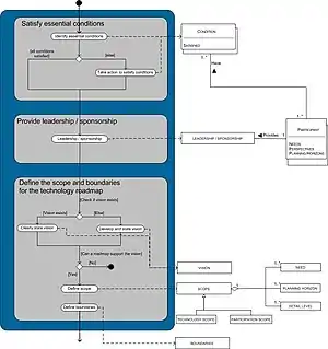 The technology roadmapping process may be conducted in three phases: preliminary activities, the development of the roadmap, and the follow-up activities phase. Because the process is too big for one model, the phases are modeled separately. In the models no different roles are made; this is because everything is done by the participants as a group.[9]