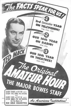 The Original Amateur Hour began on radio in 1934 as Major Bowes' Amateur Hour, and ran until the 1946 death of its creator, Major Bowes. Mack, a talent scout who had directed the show under Bowes, revived it in 1948 for ABC Radio and the DuMont Television Network.
