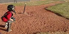 Tee-ball associations generally allow children between the ages of four and seven to play in their leagues.[1] A tee-ball coach sets the team lineup and fielding positions in the team's scorebook. The positions that get the most action in tee-ball are pitcher and first base, followed by the rest of the infield positions. In some leagues, catcher is also a special position due to the added gear that is worn; in other leagues, there is no catcher. In tee-ball, the pitcher is usually used for defensive purposes only, though gently pitched balls may be used with older or more advanced players in place of the fixed tee. The ball is placed on an adjustable tee atop the home plate at a suitable height for the batter to strike. (In some clubs, adult coaches give the batter an opportunity to try and hit a few pitched balls before going to the tee in the hope that this will further develop batting skills.)[2] Most of the other rules are similar or identical to those of baseball, though the game is played on a smaller field, typically one used for Little League or other youth baseball.[2] In addition, for the youngest tee-ball players, runs and outs are often not recorded, and every player gets to bat each inning.[1]