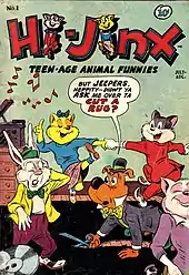 ACG's Hi-Jinx was touted as "a brand-new idea in comics" and debuted in 1947. The title was an unsuccessful combination of the teen humor and talking animal genres. Despite an invitation to "meet some real hepcats" and the work of Dan Gordon and Milt Gross, the title folded after seven issues. Dozens of teen humor heroes and heroines peopled the comics of the period and included Binky, Ozzie, Junior, Jeanie, Ginger, Kathy, Mitzi, and Patsy Walker.[9]
