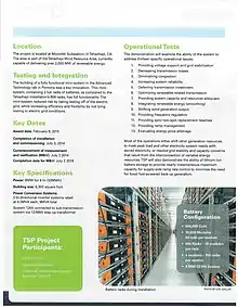 In 2016, the California Energy Storage Alliance featured TSP in the lead position in a video with policymakers, utility executives, and energy storage pioneers titled Gamechangers: How Energy Storage Transforms the Power System, which describes how SCE pioneered the use of grid energy storage.[58] Region 6 of the IEEE awarded its Director's Award to SCE in 2016 with the successful completion of TSP as one of the key accomplishments.[59] The Energy Storage Association (ESA) awarded LG Chem the Brad Roberts Award for Outstanding Industry Achievement in 2017 for marketplace and industry accomplishments during the past several years, including the successful delivery and commissioning of TSP.[60][61]