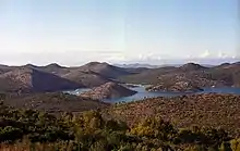 Telašćica is a 10 km long, 160–1800 m wide, deep inlet dotted with cliffs, islets and bays. The cliffs of Dugi Otok, called the stene locally, rise to 161 m above sea level and drop down to a depth of 90 m.[1] Telašćica bay, which actually consists of three smaller bays, is a good, safe harbour for all kinds of vessels. The northeastern side of the bay is completely bare, but the southwestern shore is covered in thick forest of pine, olive and fig trees.[2] There are six islets and rocks in the Bay: Korotan, Galijola, Gozdenjak, Farfarikulac, Gornji Školj and Donji Školj. Lake Mir is a saltwater lake on a narrow strip of land between Telašćica Bay and the open sea. The lake is salty due to underground connections to the sea.[3]