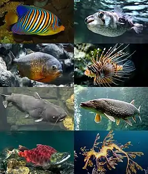 | Examples of teleosts from different orders: Royal angelfish (Perciformes), Slender-spined porcupine fish (Tetraodontiformes), Red-bellied piranha (Characiformes), Spotfin lionfish (Scorpaeniformes), Blue catfish (Siluriformes), Northern pike (Esociformes), Sockeye salmon (Salmoniformes), and Leafy seadragon (Syngnathiformes). | |
