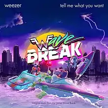 For the song, Weezer partnered with Funktronic Labs, the indie video game developers responsible for Wave Break, "the world's first skateBOATING game, inspired by arcade skateboarding classics".[1] A "Weezy Mode" was added to the game, based around the song.[2] "Tell Me What You Want" first surfaced as a B-side cut from Weezer's fifteenth studio album, Van Weezer.[1] It was created as a "stream-safe option" so that livestreamers on platforms like Twitch would not get copyright claims while playing Wave Break.[2]