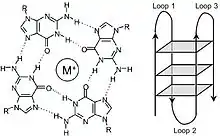 Data has shown that TERRA interacts with telomeric DNA to form G-Quadruplex structures both in vitro and in vivo.[22][23] These structures form due to the abundance of guanine found in the TERRA transcript and their ability to associate through Hoogsteen hydrogen bonding. The resulting square planar structure is known as a guanine tetrad (also known as a G-tetrad or G-quartet) and when two or more guanine tetrads stack on top of each other, they form a G-quadruplex. These complex structures have been shown help to modulate telomere length through inhibition telomerase's ability to add tandem TTAGGG repeats, specifically in cells with long telomeres. This inhibitive effect seems to function in a telomere length-dependent manner;[2] that is, TERRA levels inversely correlate with increased activity of telomere elongation. In general, TERRA has been shown to be most abundant in cells with long telomeres,[1][2] while cells with short telomeres express comparatively lower levels of transcript expression. There is also evidence that overexpression of TERRA in human cells can help promote telomere processing by inhibiting the 5'-3' exonuclease Exo1 through the Ku70/80 dimer.[21][24]
