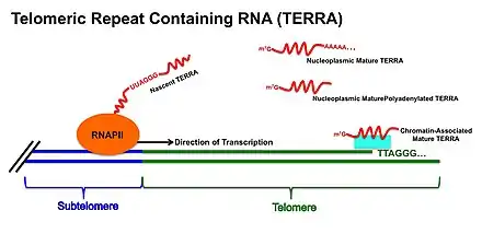 TERRA is an evolutionarily conserved long-non-coding RNA found in many nucleus-containing eukaryotic cells such as humans (Homo sapiens), budding yeast (Schizosaccharomyces cerevisiae), fission yeast (Schizosaccharomyces pombe), mice (Mus musculus), zebrafish (Danio rerio), and various plants (Arabidopsis thaliana, et cetera).[1][2][3][4] TERRA is transcribed from DNA as a continuous sequence in most tissues from the subtelomeric and telomeric regions at the end of linear chromosomes. Transcription occurs in the 5' to 3' direction (from the centromere to telomere) and TERRA transcripts are heterogeneous in length, ranging anywhere from 100-bases up to 9-kilobases in length for human cells.[5] The majority of TERRA transcription has been shown to be carried out by RNA Polymerase II (RNAPII),[2][3] although RNA Polymerase I and III may also have functions in TERRA transcription for mammals.[6]