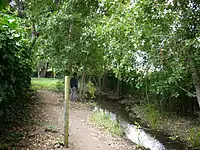 The middle fork flows through Temescal Canyon mostly in underground culverts, beneath the Grove Shafter Freeway starting near the Caldecott Tunnel and underneath the interchange with State Route 13. It joins the south fork at Lake Temescal.[3] Before the Caldecott tunnel project (1934–37), this fork entered the lake via a prominent inlet that was traversed by a trestle bridge of the Sacramento Northern Railroad. The inlet was filled in and the trestle replaced by a large concrete embankment which exists to this day.