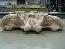 Temnospondyls' vertebrae are divided into several segments. In living tetrapods, the main body of the vertebra is a single piece of bone called the centrum, but in temnospondyls, this region was divided into a pleurocentrum and intercentrum. Two primary types of vertebrae are recognized in temnospondyls: stereospondylous and rhachitomous vertebrae. In rhachitomous vertebrae, the intercentra are large and wedge-shaped, and the pleurocentra are relatively small blocks that fit between them. Both elements support a spine-like neural arch, and well-developed interlocking projections called zygapophyses strengthen the connections between vertebrae. The strong backbone and strong limbs of many rhachitomous temnospondyls allowed them to be partially, and in some cases fully, terrestrial. In stereospondylous vertebrae, the pleurocentra have been greatly reduced or lost entirely, with the intercentra enlarged as the main body of the vertebrae. Early concepts of stereospondyl required the pleurocentra to be entirely absent, but newer concepts only require that the intercentrum has become greatly enlarged.[61] This weaker type of backbone indicates that stereospondylous temnospondyls spent more time in water.[62] Additional types that are less common are the plagiosaurid-type in which there is a single enlarged centrum of uncertain homology;[63][64][65][66][67] and the tupilakosaurid-type vertebrae (diplospondyly) in which the pleurocentra and intercentra are the same size and form discs; this occurs in tupilakosaurid dvinosaurs but also at least some brachyopids and several other non-temnospondyls.[68][69][70] The neural spines tend to be of similar height throughout the presacral region of the trunk, but some temnospondyls exhibit increasing height towards the mid-trunk, followed by a decrease in height to produce a more hump-backed contour.[71][72][73] The most extreme is observed in the dissorophid Platyhystrix, which has greatly elongated neural spines that form a large sail on its back.[74][75] The function of this sail, like that of the contemporaneous sphenacodontids and edaphosaurids, remains enigmatic, but it is thought to have stiffened the vertebral column in association with the relative terrestriality of this clade.[76] The majority of temnospondyls have presacral counts between 23 and 27, with reduction observed in some amphibamiforms[77][78][5][6] and elongation observed in many dvinosaurs.[79][80][68][81] Caudal length is highly variable, and complete caudal sequences are rare. Based on Eryops, more than 30 caudal positions were possible in some taxa.[71]