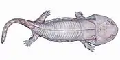 Many temnospondyls are much larger than living amphibians, and superficially resemble crocodiles, which has led many taxa to be named with the suffix -suchus. The largest taxa, which were predominantly the Mesozoic stereospondyls, had skulls exceeding one meter in length, and the entire animal would have been several meters in length (for reference, the largest living amphibian, Andrias, is about 1.8 meters in body length).[1][2][3][4] Others are smaller and resemble salamanders, in particularly the amphibamiform and micromelerpetid dissorophoids.[5][6]