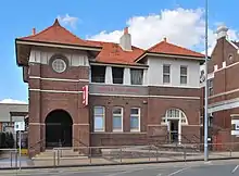 The eaves are boxed to conceal the rafters, and lined with a flat sheet, possibly an early example of asbestos-cement sheeting. The left tower has a "bulls-eye" round window comprising nine panes of glass. The left tower has a simple open stilted arch for the main entry. There are non-original concrete steps with a steel handrail giving access to the main entry porch and some of the facility's post boxes. The porch has a tiled floor and a painted timber ceiling. Entry doors are timber framed, and primarily glazed and located in the south wall of the porch. They broadly match the entry doors at the right-hand side of the façade. There is a surviving eight-pane transom window above. These doors are adjoined by the later disabled access ramp access which has been installed in front of the building, infilling the recessed middle bay of the building. The ramp structure apparently conceals the building's foundation stone.[1]