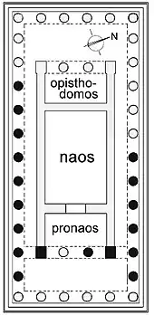 Excluding the corner blocks, each side of the temple was composed of twenty-three intermediate blocks.[7]At the centre of the temple, beyond the colonnade, there would have been the hall of worship (naos), a windowless rectangular room, similar to the partly intact hall at the Temple of Hephaestus. It would have contained, at one end facing the entrance, the cult image, a colossal, ceiling-height (6 metres (20 ft)) bronze statue of Poseidon.[11] It has been found that the original plan for the temple was to construct 6x12 columns rather than the 6x13 columns that we find at the temple today, which was discovered by German archaeologist Wilhelm Dorpfeld.[8] At the temple, it can be seen that there are large stretches of the paintings on the temple were preserved from erosion on the marble. The parts that did suffer erosion still have remnants of the outline of the art that once covered the surface.[12]