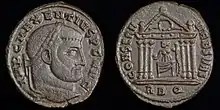 The Temple of Venus and Roma (Latin: Templum Veneris et Romae) is thought to have been the largest temple in Ancient Rome. Located on the Velian Hill, between the eastern edge of the Forum Romanum and the Colosseum, in Rome, it was dedicated to the goddesses Venus Felix ("Venus the Bringer of Good Fortune") and Roma Aeterna ("Eternal Rome").