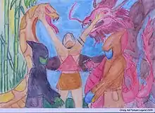 Thousands of years ago, many Temuan people died because they had committed "Celau" (the sins that angered god and their ancestors; as it is also called Talan in Semaq Beri language[33]). Their god has sent a "Celau" punishment in a form of a great flood which had drowned all the Temuan sinners that day. Only two of the Temuans, named Mamak and Inak Bungsuk survived that day by climbing on an Eaglewood tree at Gunung Raja (Royal Mountain) located at the border of Selangor and Pahang state.[18] There was a Temuan village over there named Kampung Orang Asli Pertak. Mamak and Inak Bungsuk survived because they had an enchanting mantra or spell to ease down the "Celau" storm.[27] Gunung Gajak (Gunung Rajah, Pahang, Malaysia) became the birth places and ancestral home of the Temuan tribe.[34]