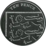 In August 2005 the Royal Mint launched a competition to find new reverse designs for all circulating coins apart from the £2 coin.[7] The winner, announced in April 2008, was Matthew Dent, whose designs were gradually introduced into the circulating British coinage from mid-2008.[8] The designs for the 1p, 2p, 5p, 10p, 20p and 50p coins depict sections of the Royal Shield that form the whole shield when placed together. The shield in its entirety was featured on the now-obsolete round £1 coin. The 10p coin depicts part of the first quarter of the shield, showing two of the lions passant from the Royal Banner of England, with the words TEN PENCE above the shield design. The coin's obverse remains largely unchanged, but the beading (the ring of dots around the coin's circumference), which no longer features on the coin's reverse, has also been removed from the obverse.