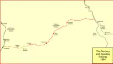 The Tenbury and Bewdley Railway was an English railway company that built its line from Bewdley in Worcestershire to Tenbury station, which was in Shropshire. The line connected the Severn Valley Railway at Bewdley with the Tenbury Railway at Tenbury. The Tenbury Railway connected at Woofferton with the Shrewsbury and Hereford Railway main line. Two railways were sometimes referred to as the Wyre Forest line or simply the Tenbury Line.