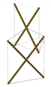 The tensegrity icosahedron, first studied by Snelson in 1949,[30] has struts and tendons along the edges of a polyhedron called Jessen's icosahedron. It is a stable construction, albeit with infinitesimal mobility.[31][32] To see this, consider a cube of side length 2d, centered at the origin. Place a strut of length 2l in the plane of each cube face, such that each strut is parallel to one edge of the face and is centered on the face. Moreover, each strut should be parallel to the strut on the opposite face of the cube, but orthogonal to all other struts. If the Cartesian coordinates of one strut are and , those of its parallel strut will be, respectively, and . The coordinates of the other strut ends (vertices) are obtained by permuting the coordinates, e.g., (rotational symmetry in the main diagonal of the cube).