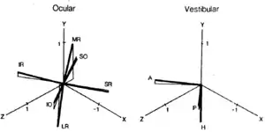 In 1986, Pellionisz described the geometrization of the "three-neuron vestibulo-ocular reflex arc" in a cat using tensor network theory.[10] The "three-neuron vestibulo-ocular reflex arc" is named for the three neuron circuit the arc comprises. Sensory input into the vestibular system (angular acceleration of the head) is first received by the primary vestibular neurons which subsequently synapse onto secondary vestibular neurons.[10] These secondary neurons carry out much of the signal processing and produce the efferent signal heading for the oculomotor neurons.[10] Prior to the publishing of this paper, there had been no quantitative model to describe this "classic example of a basic sensorimotor transformation in the central nervous system" which is precisely what tensor network theory had been developed to model.[10]
