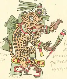 In Aztec mythology, Tepēyōllōtl Nahuatl pronunciation: [tepeːˈju˕ːɬːu˕ːtɬ] ("heart of the mountains"; also Tepeyollotli) was the god of darkened caves, earthquakes, echoes and jaguars. He is the god of the Eighth Hour of the Night, and is depicted as a jaguar leaping towards the sun. In the calendar, Tepeyollotl rules over both the third day, Calli (house), and the third trecena, 1-Mazatl (deer). He is the eighth Lord of the Night.[1]