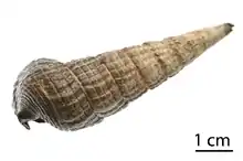 The shell is generally described as elongate, thick, solid and turreted. It comprises as many as 20 flat-sided whorls with the early whorls being sculptured with strong colabral axial ribs. Spiral incised lines appear on the ninth or tenth whorl. These gradually increase in number to three.[2] Growth is determinate for this species and full maturity is indicated by a thickened aperture margin. The size of mature adult snails varies between populations and in some cases maturity has been reported for individuals at only 45 mm total shell length.[2]
