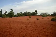 Teri or Teri dune complex is a coastal landscape peculiar to some parts of Tamil Nadu mainly in southeastern India. The landscape consists of sediments dating to the Quaternary Period and made of marine deposits with aeolianite and characteristic red sand and silt dunes. These red soils are thought to have originated in the Pleistocene.[1] Robert Bruce Foote hypothesized that these dunes were created by the action of winds (aeolian) lifing the fine silt fraction from further east.[2] These dunes are oriented along the axis running parallel to the coast and between the latitudes of 8°00′ to 9°30′ N and longitudes 77°18′ to 79°00′ E. The soils also have calcium deposits replacing the old roots of vegetation.[3] The soil is rich in ilmenite and the red colour is derived from haematite originating from garnet.[4][5][6]