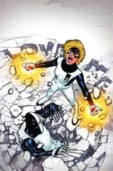 Rested from her stay with the Titans, Atlee returns to be the sidekick of Power Girl, successfully helping her save Manhattan from the Ultra-Humanite.[30] After that, she elects Manhattan as her base of operation, to benefit from the constant mentoring of Power Girl both in establishing and maintaining a human identity, and in her superhero persona.[31] She takes on an Australian accent in her civilian identity, finding the half-truth of her being from "down under" quite humorous. She and Power Girl begin a close friendship, going to movies and even shopping together at an IKEA-esque Scandinavian furniture store. Atlee also decides to drop her Australian accent, instead claiming that her new cover identity is that of a spy, something Power Girl finds quite humorous.[32]