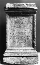 Dedicatory inscriptions to either Tellus or Terra are relatively few,[22]: 304 but epitaphs during the Imperial period sometimes contain formulaic expressions such as "Terra Mater, receive me."[61] In the provincial mining area of Pannonia, at present-day Ljubija, votive inscriptions record dedications to Terra Mater from vilici, imperial slave overseers who ran operations at ore smelting factories (ferrariae).[62][63]: 58–59
