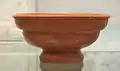 Modern "terra sig" should be clearly distinguished from the close reproductions of Roman wares made by some potters deliberately recreating and using the Roman methods.[1] The finish called 'terra sigillata' by studio potters can be made from most clay, mixed as a very thin liquid slip and settled to separate out only the finest particles to be used as terra sigillata. When applied to unfired clay surfaces, "terra sig" can be polished with a soft cloth or brush to achieve a shine ranging from a smooth silky lustre to a high gloss. The surface of ancient terra sigillata vessels did not require this burnishing or polishing. Burnishing was a technique used on some wares in the Roman period, but terra sigillata was not one of them. The polished surface can only be retained if fired within the low-fire range and will lose its shine if fired higher, but can still display an appealing silky quality.